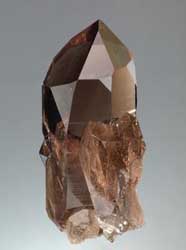 Gem quality smokey Quartz crystal, completely transparent top to bottom. Bevelled faces are present on the upper right hand corner of two prism faces, indicating Dauphine twinning. The regular faces have high luster while the bevelled faces have a matte luster. Complex, undamaged 'Swiss' quality Quartz crystal. ©2010-2018 Marin Mineral |